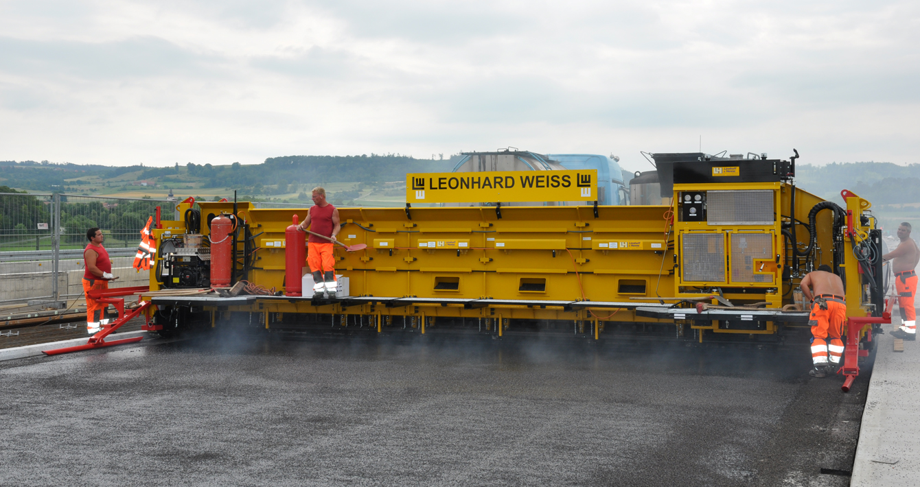 Особенностью комбинированных укладчиков литого асфальта является наличие интегрированного щебнераспределителя. Конструкция укладчиков компании Linnhoff & Henne очень компактна, что позволяет применять их для укладки литого асфальта как на широких мостах, так и в тоннелях, гаражах и на крытых производственных площадках.