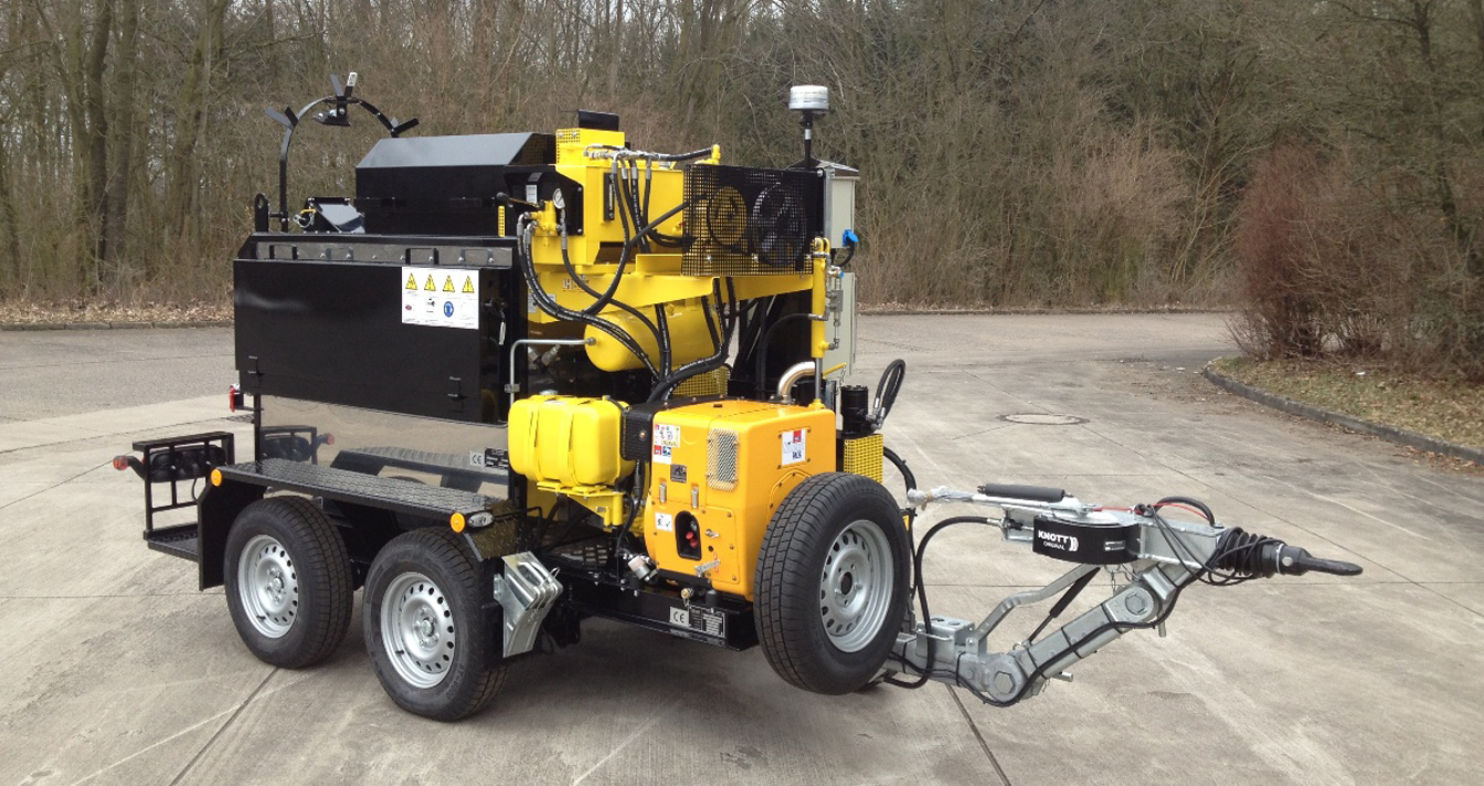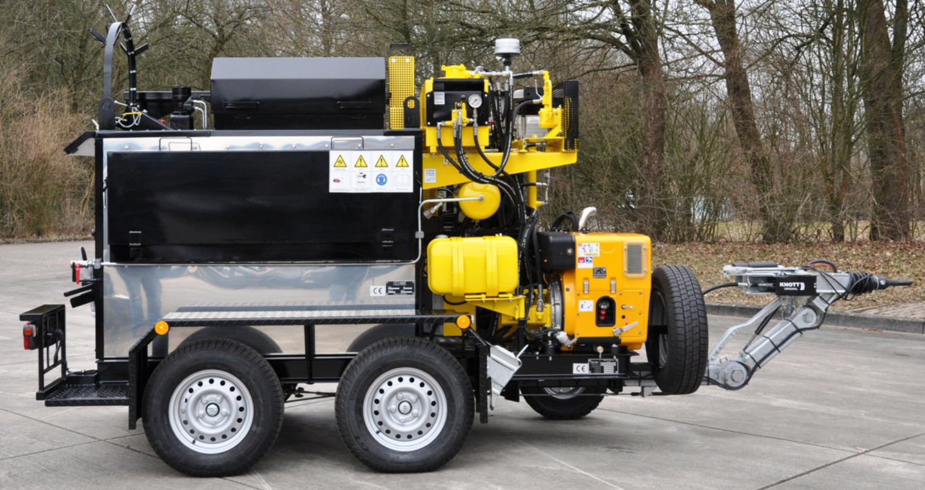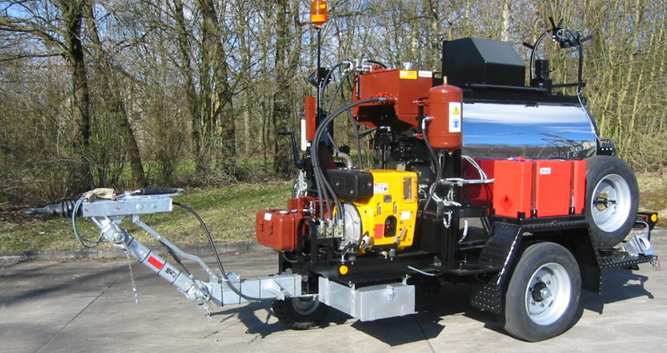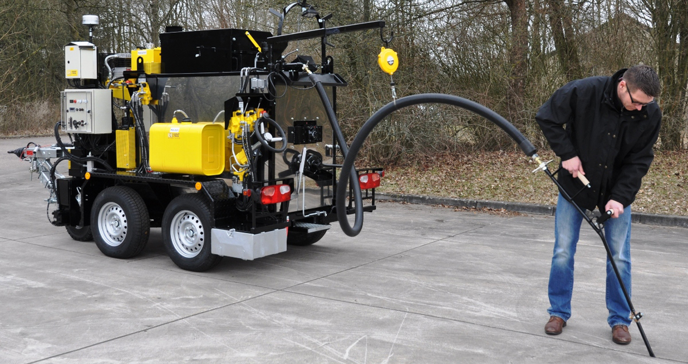Заливщик швов битумом буксируется к месту выполнения работ при помощи автомобиля-тягача. После отсоединения тягово-сцепного устройства прицепа оператор запускает дизельный двигатель, с помощью которого опирает прицеп на ведущее колесо с гидравлическим приводом. Ведущее колесо обеспечивает перемещение заливщика швов битумом в нужном направлении с требуемой скоростью. При наличии у прицепа четырех колес два из них поднимаются, что обеспечивает хорошее сцепление ведущего колеса с поверхностью. Ручной заливщик доставляется к месту работ вручную при помощи тележки.